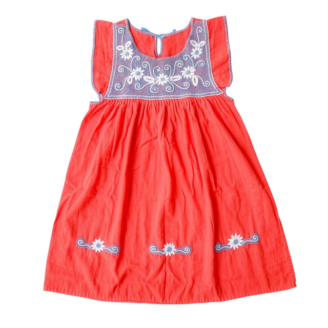 胸元にアグアカテナンゴ村の刺繍が贅沢に施されたノースリーブワンピース。 ぷっくりとした立体的なお花の刺繍は「ロココ刺繍」と呼ばれ、アグアカテナンゴ村に古くから伝わる伝統技術によるものになります。 刺繍は単色ながらも、お花と葉っぱが整列した柄がインパクトのある一枚です。 ◆サイズ◆ 着丈64cm、バスト31cm、肩幅29cm、首周り50cm(100サイズ相当) ※首周りが若干小さめです。お子様の頭囲をご確認のうえ、ご購入をお願いいたします。 ◆素材◆ 本体:綿100% 刺繍糸:綿100% ◆生産地◆ メキシコ ※お使いの端末や閲覧環境により、写真と実物の色味や質感が多少異なって見えることがございます。 =========================== メキシコの職人によってハンドメイドで作られた一点もののお洋服です。 ブランドものとは違い、縫製の緩さやほつれ感がございます。 また、同じ年齢表記でも商品によって個体差があります。 必ず各商品ページ記載のサイズをご確認のうえご購入下さい。 ===========================