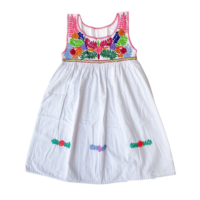 胸元にアグアカテナンゴ村の刺繍が贅沢に施されたノースリーブワンピース。 刺繍糸で埋め尽くすようにデザインされた草花の刺繍は「マルガリータ刺繍」と呼ばれ、アグアカテナンゴ村に古くから伝わる伝統技術によるものになります。 真っ白なマンタ生地に優しいカラフルなマルガリータ刺繍が夏らしく可愛い一枚です。 ◆サイズ◆ 着丈69cm、バスト31cm、肩幅27cm、首周り59cm(110-120サイズ相当) ◆素材◆ 本体:綿100% 刺繍糸:綿100% ◆生産地◆ メキシコ ※お使いの端末や閲覧環境により、写真と実物の色味や質感が多少異なって見えることがございます。 =========================== メキシコの職人によってハンドメイドで作られた一点もののお洋服です。 ブランドものとは違い、縫製の緩さやほつれ感がございます。 また、同じ年齢表記でも商品によって個体差があります。 必ず各商品ページ記載のサイズをご確認のうえご購入下さい。 ===========================