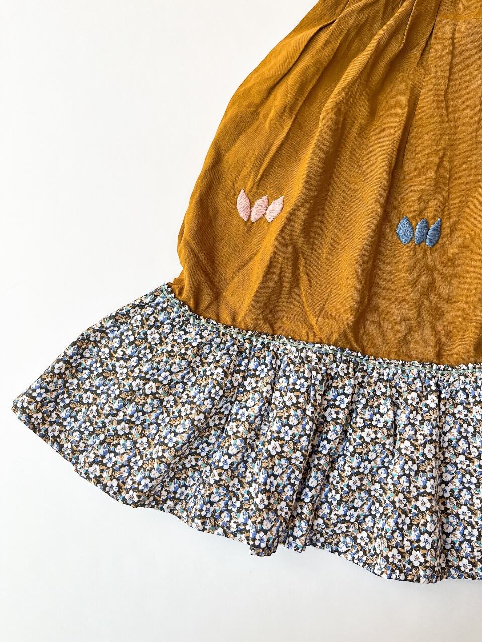 優しい色合いのロココ刺繍と女の子らしい花柄生地との組み合わせがとても可愛いです。