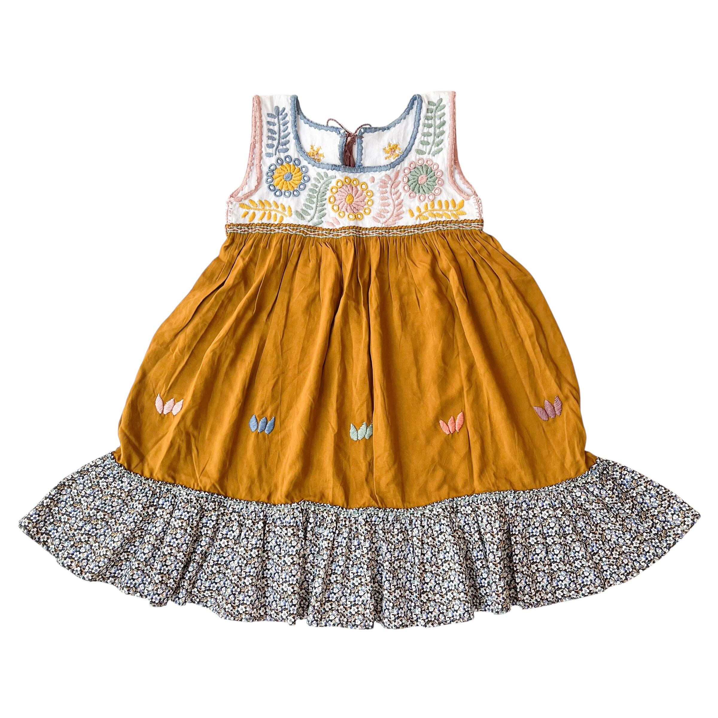 【4Y】アグアカテナンゴ刺繍花柄ワンピース[ブラウン]