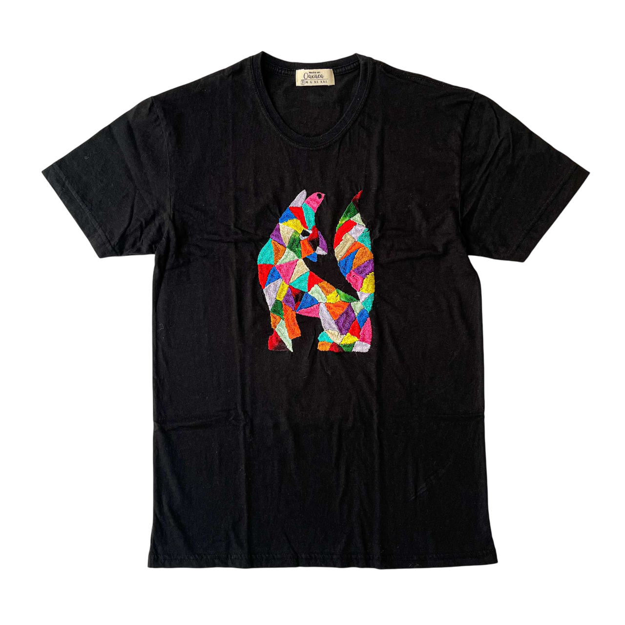 ユニセックスでデイリーに使いやすい3色のTシャツにメキシコらしいカラフルな色合いのハチドリ・コヨーテ・ネコがデフォルメ刺繍されています。
