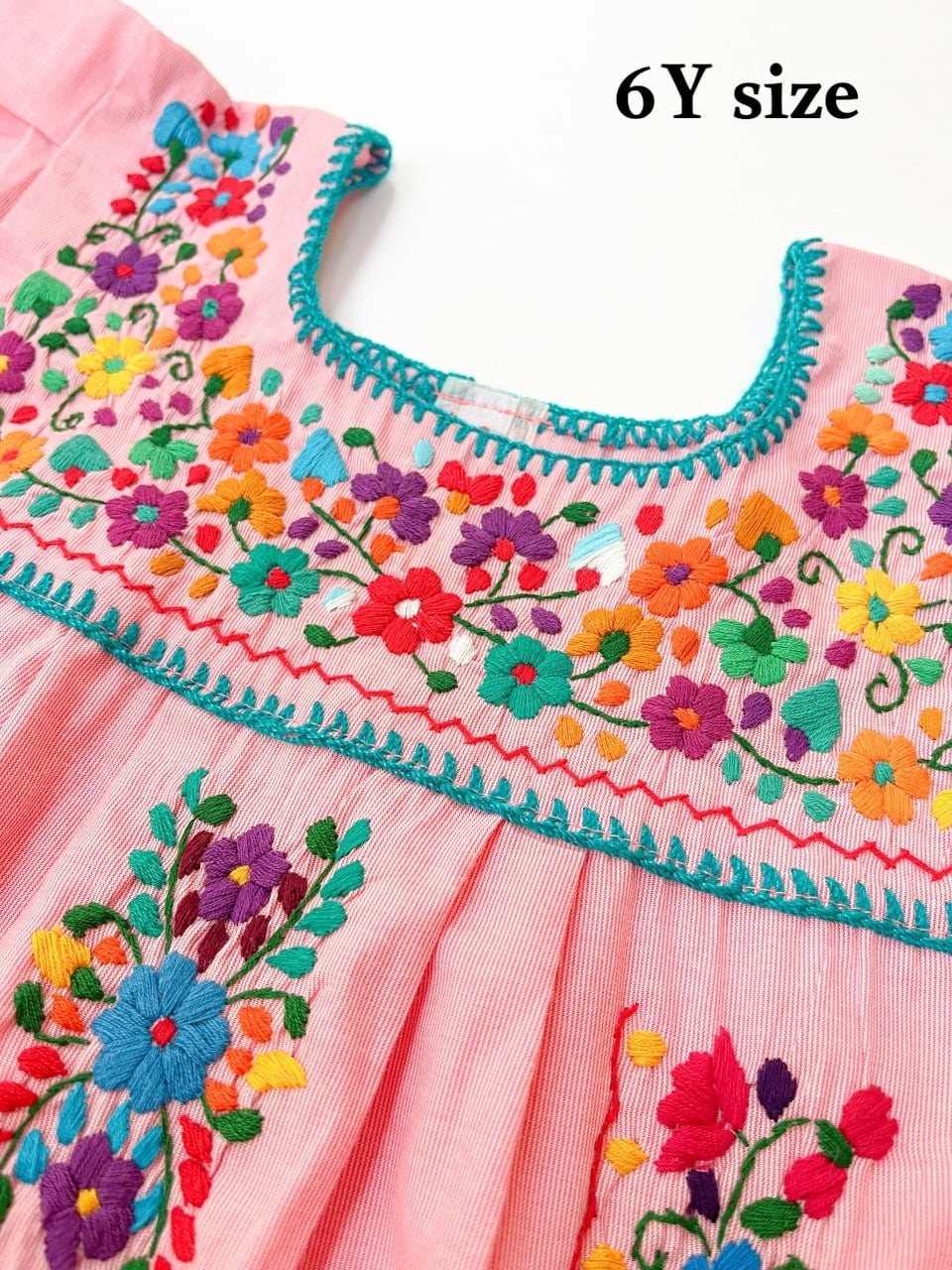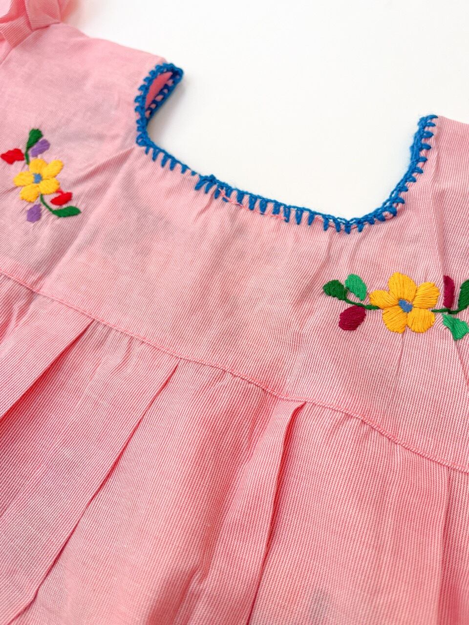 赤と白の細いストライプ柄が珍しいメキシコ刺繍ワンピース。