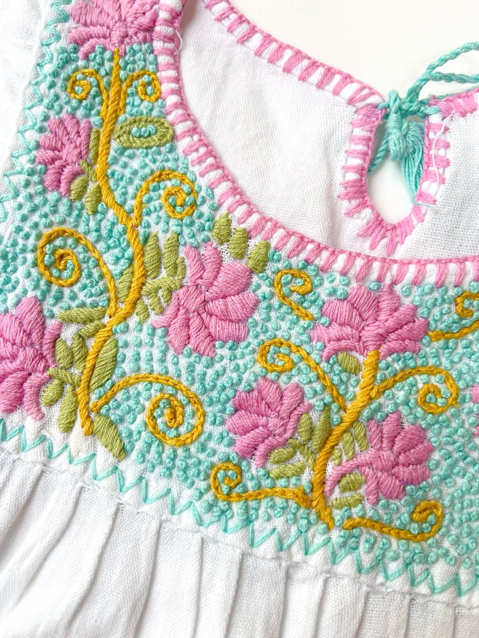 点々と細かい結び目を均等に刺繍する技法は「Bordado de nuditos(結び目の刺繍)」と呼ばれており、アグアカテナンゴ村に古くから伝わる伝統技術によるものになります。