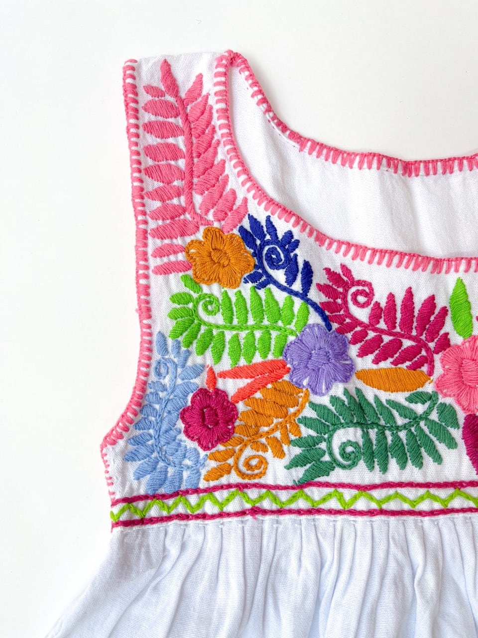 真っ白なマンタ生地に優しいカラフルなマルガリータ刺繍が夏らしく可愛い一枚です。