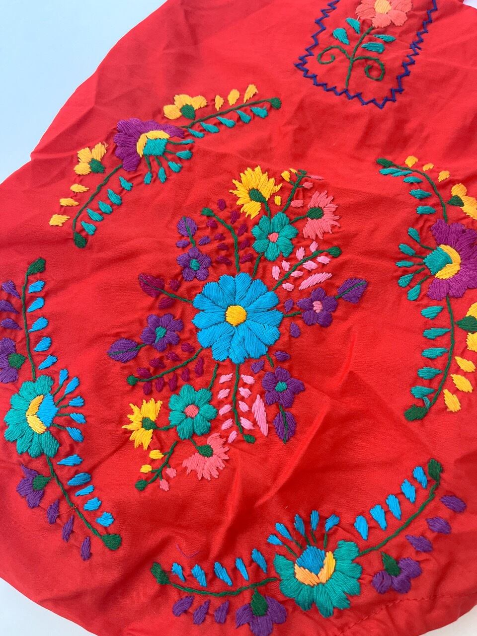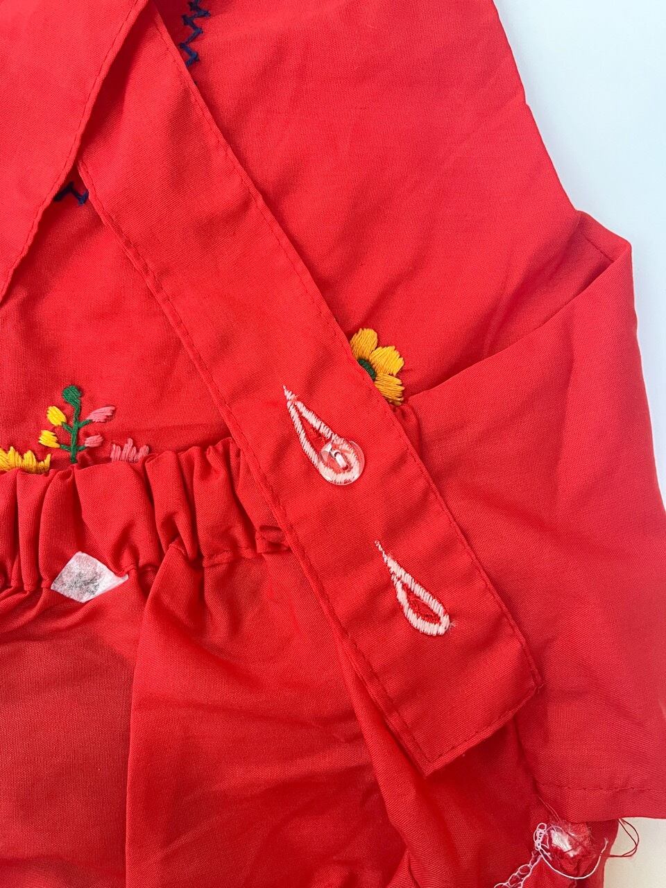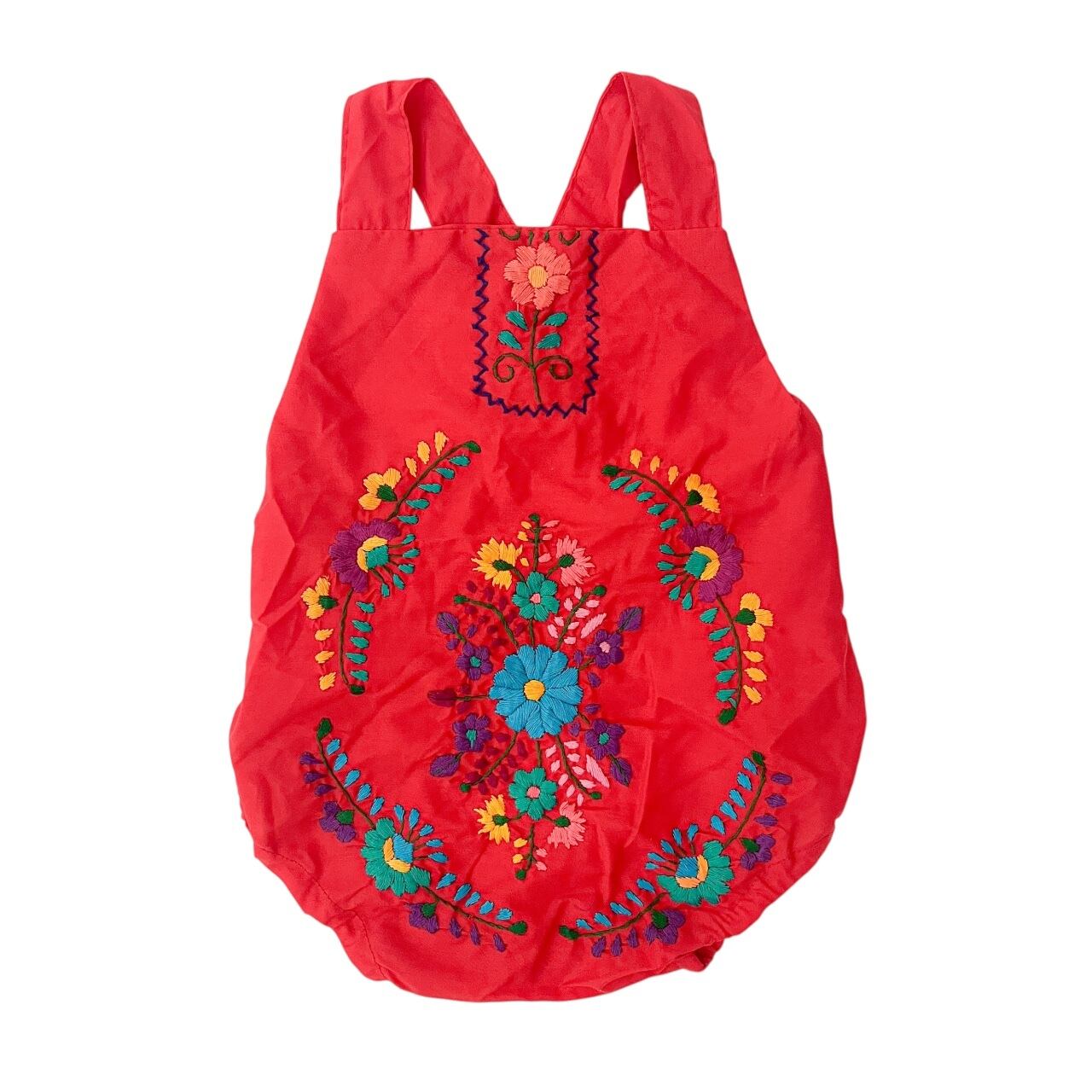 メキシコ刺繍がたっぷり施されたサロペットタイプのロンパース。