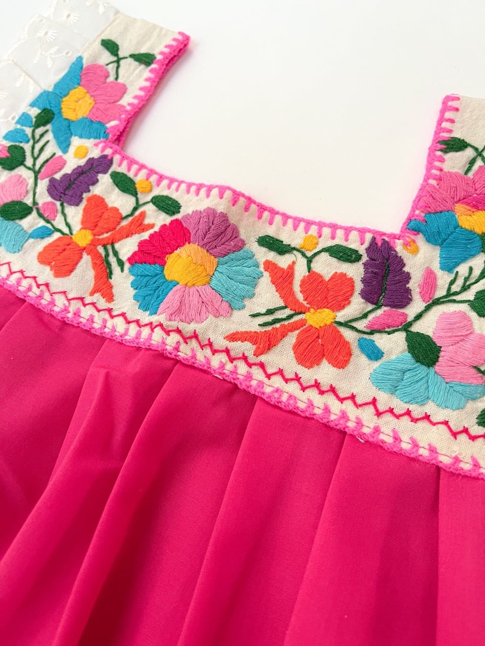 華やかな刺繍はもちろん、ビビッドカラーのスカートがメキシコらしさを感じる一枚です。