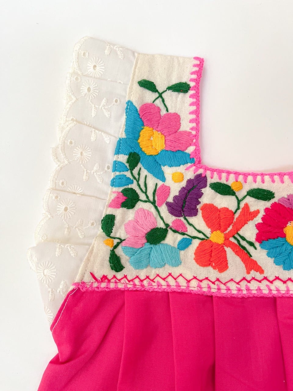 カラフルなメキシコ刺繍が胸元に施された異素材切り替えのワンピース。