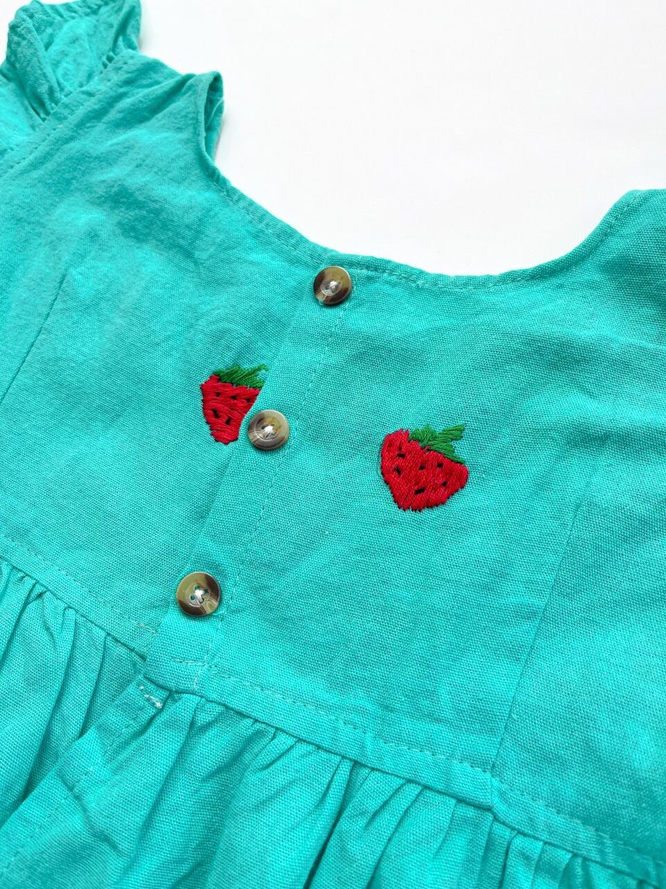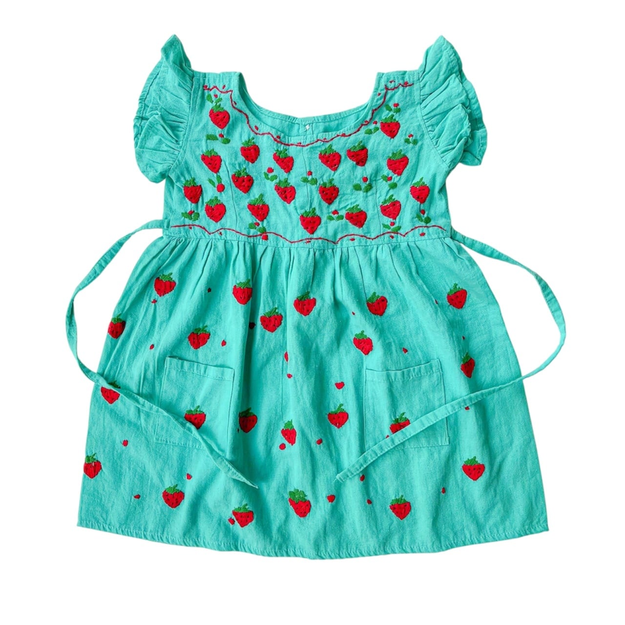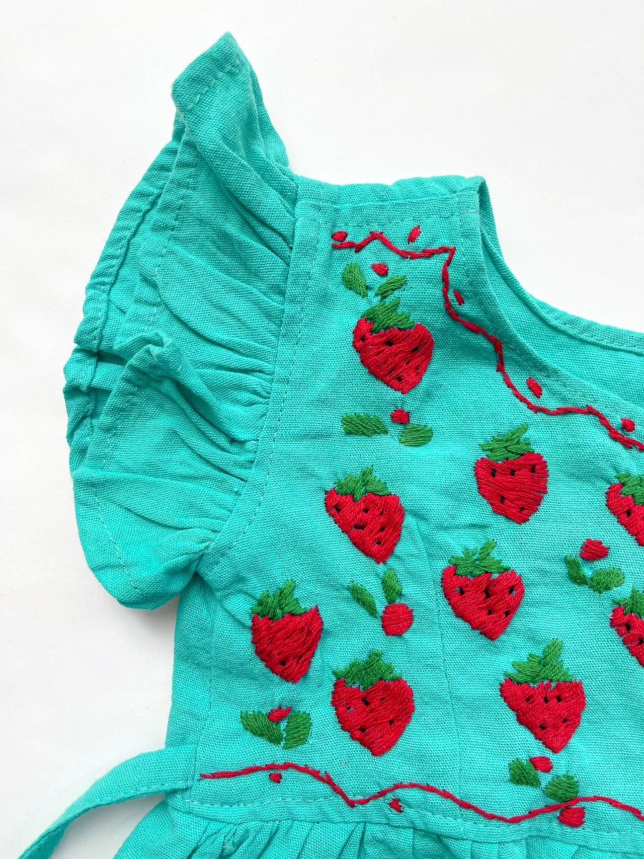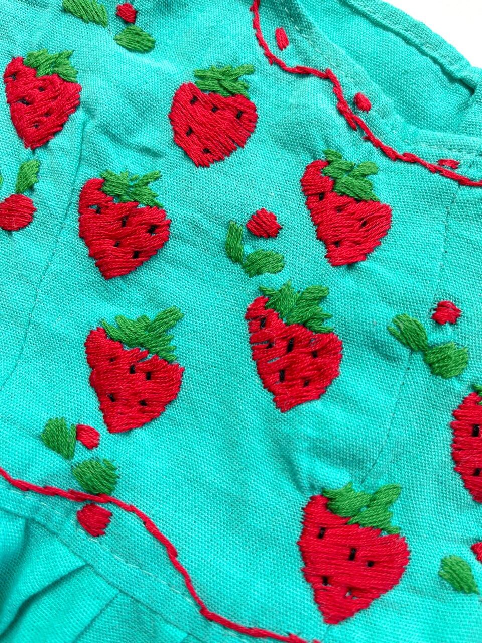 きれいな緑色のコットン生地に手刺繍されたたくさんのイチゴが映える一枚です。