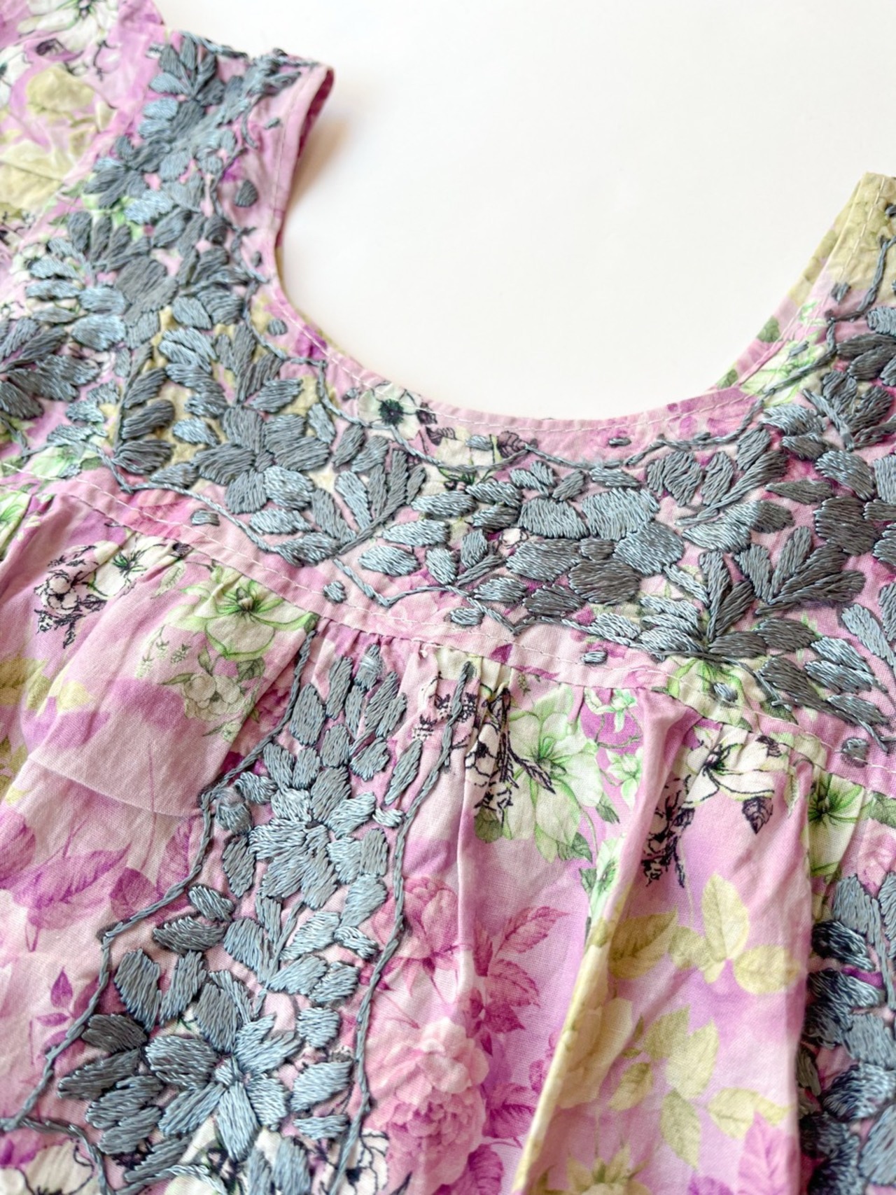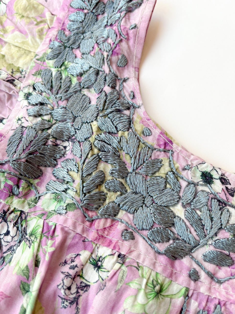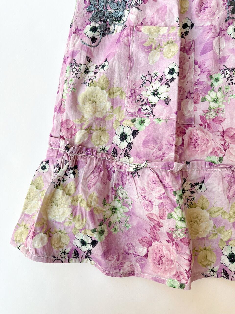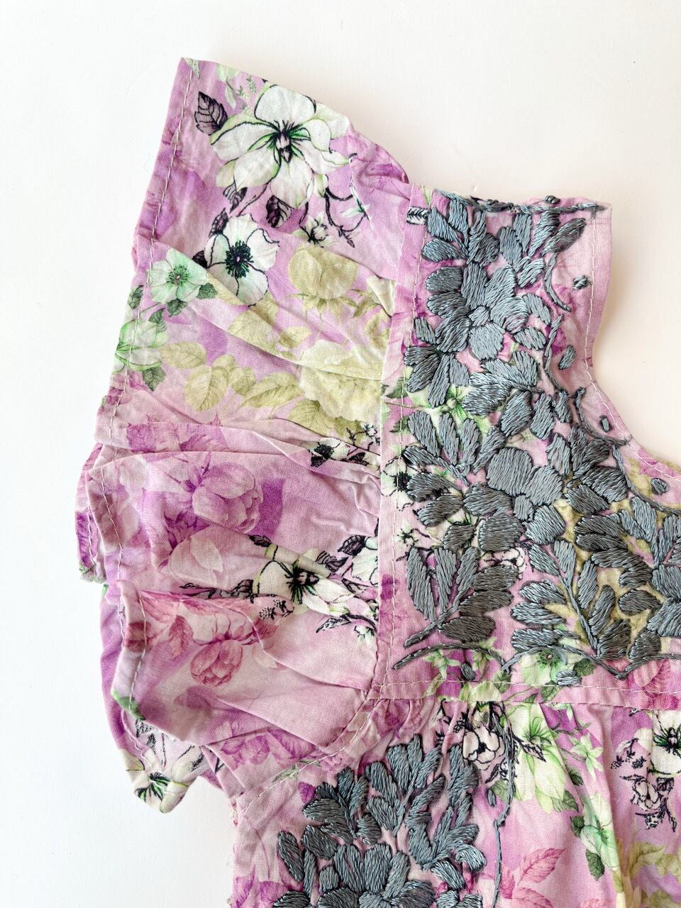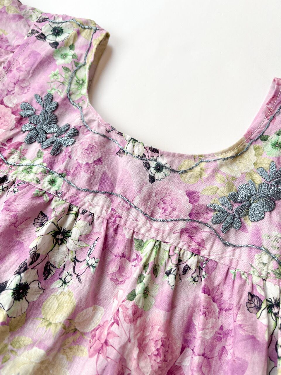 紫色ベースの花柄生地に刺繍されたグレーの小花刺繍がとても華やかな一枚です。