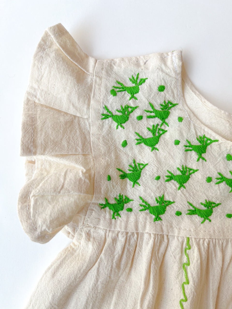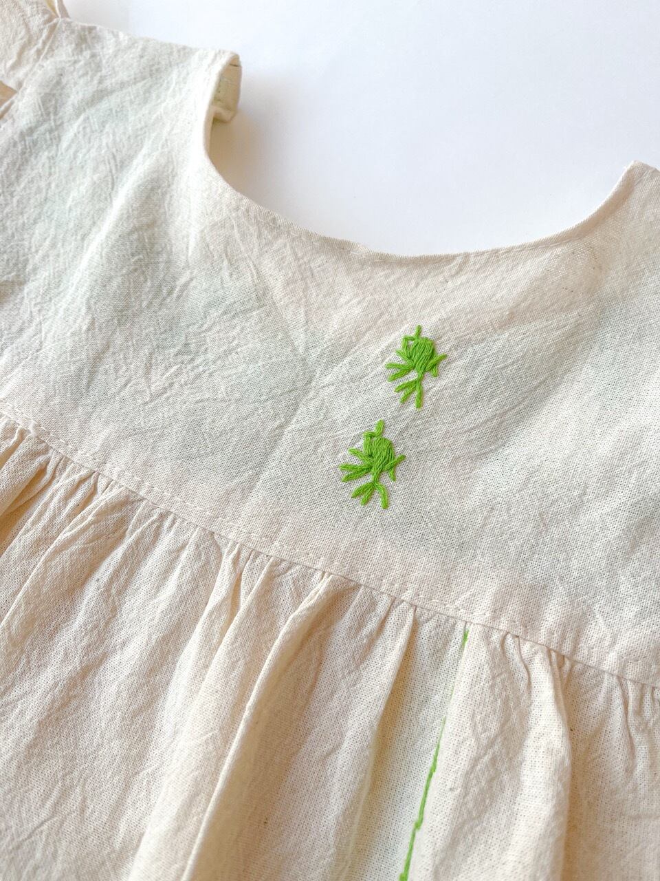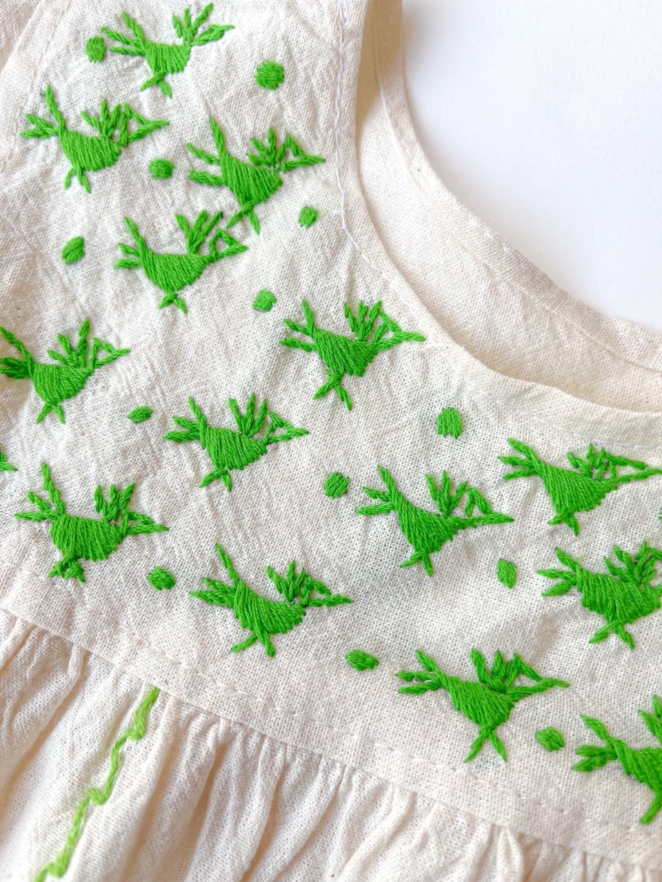 ナチュラルな生成りのコットン生地に手刺繍された黄緑色の鳥たちが映えて、周りの注目を浴びること間違いなしの一枚です。