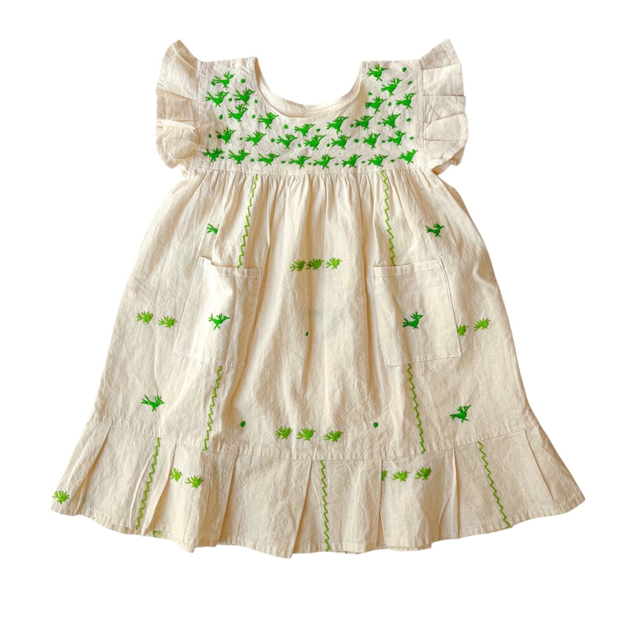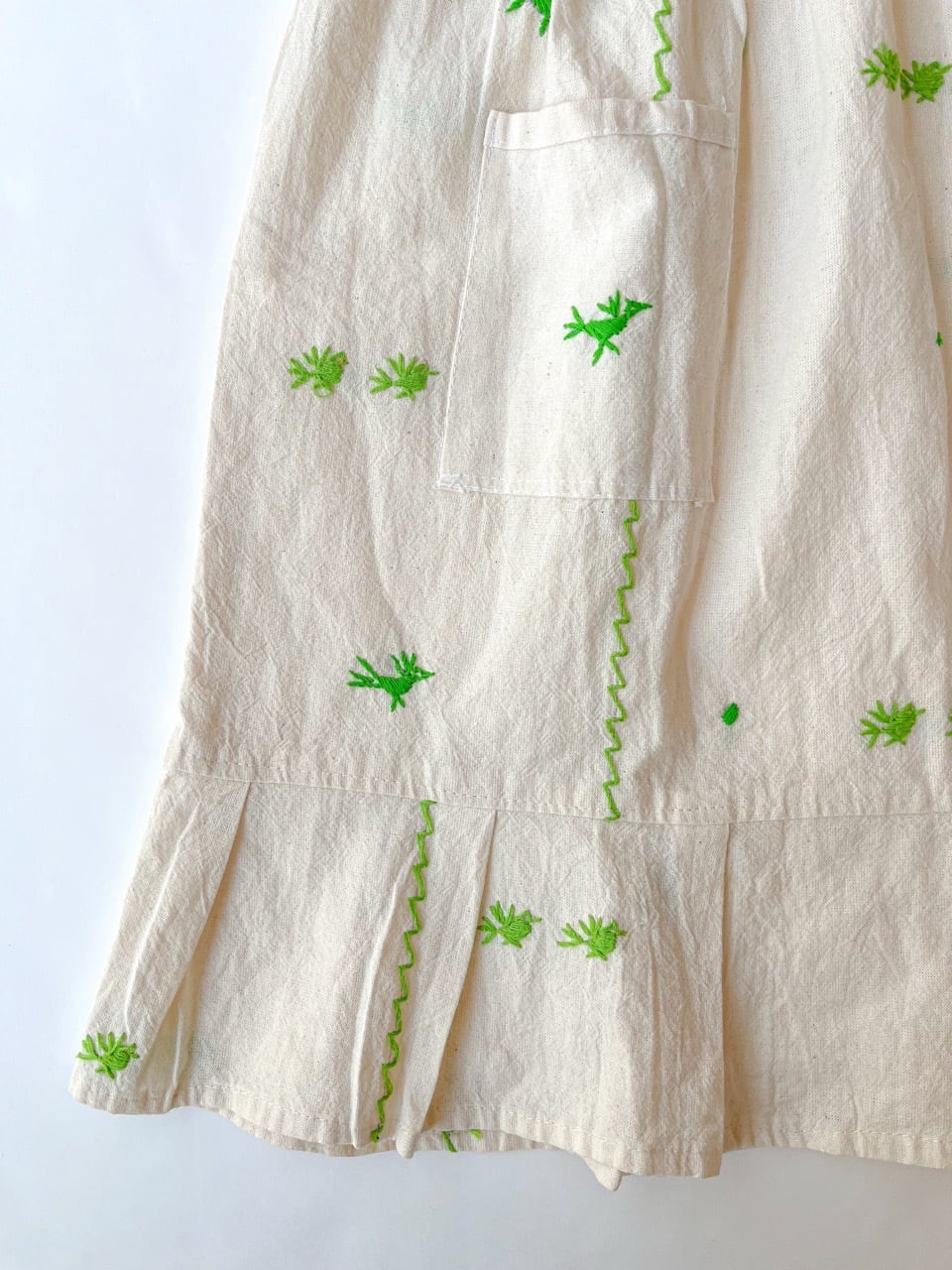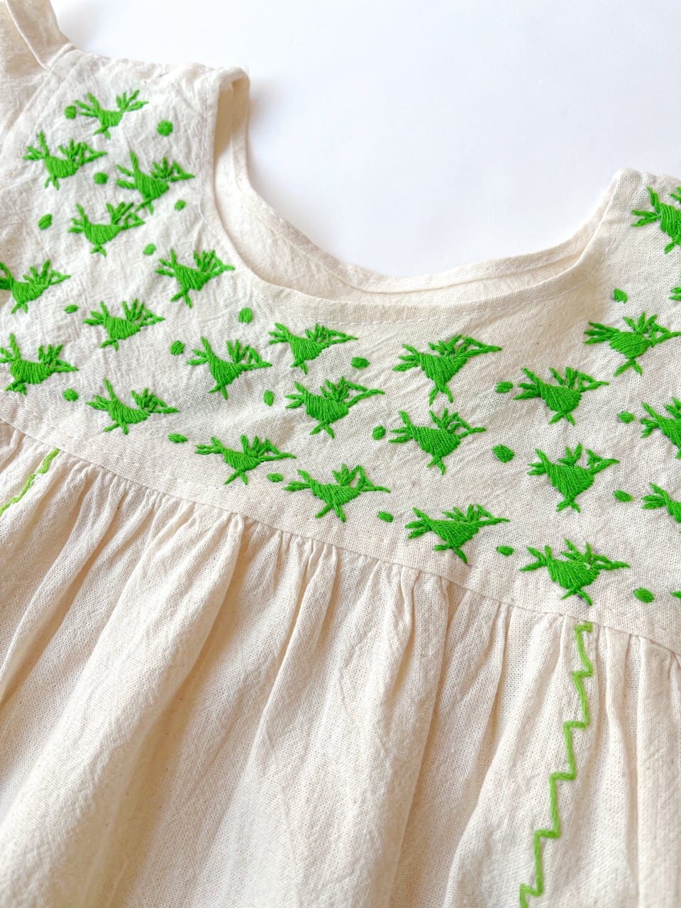 ナチュラルな生成りのコットン生地に手刺繍された黄緑色の鳥たちが映えて、周りの注目を浴びること間違いなしの一枚です。