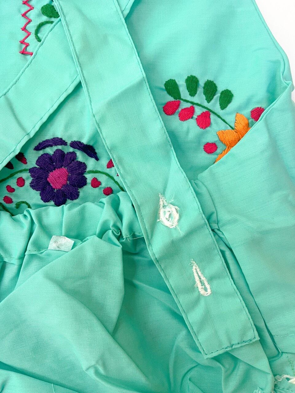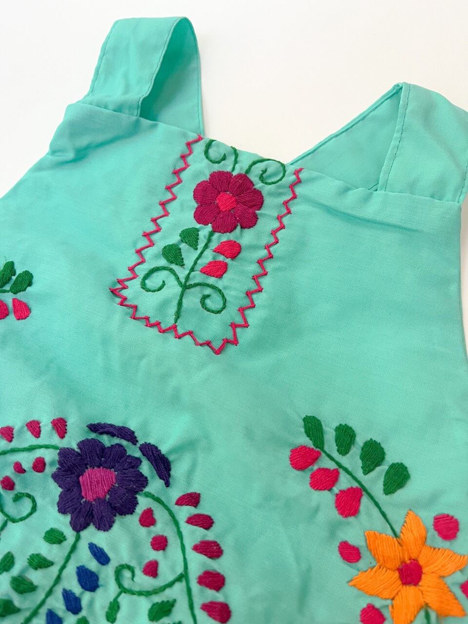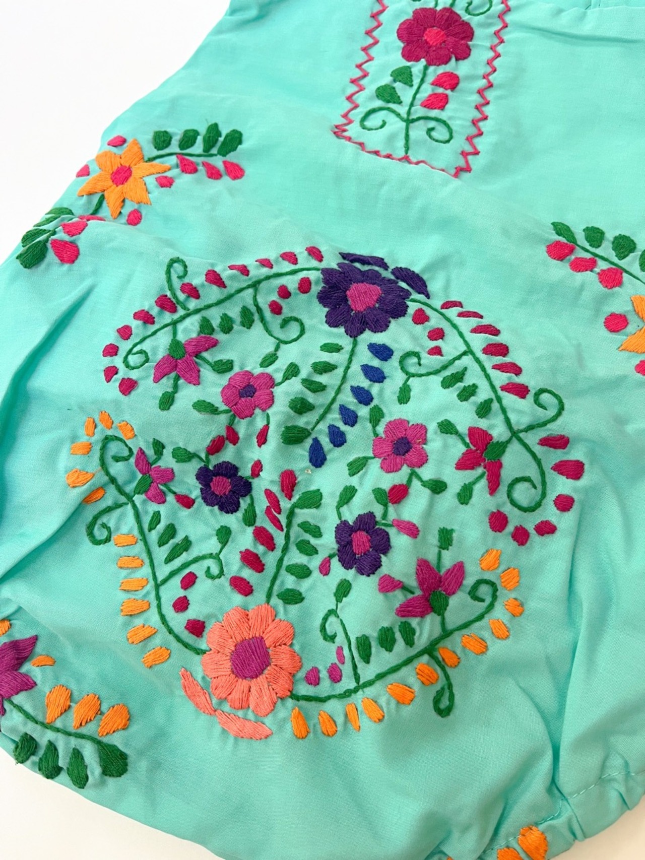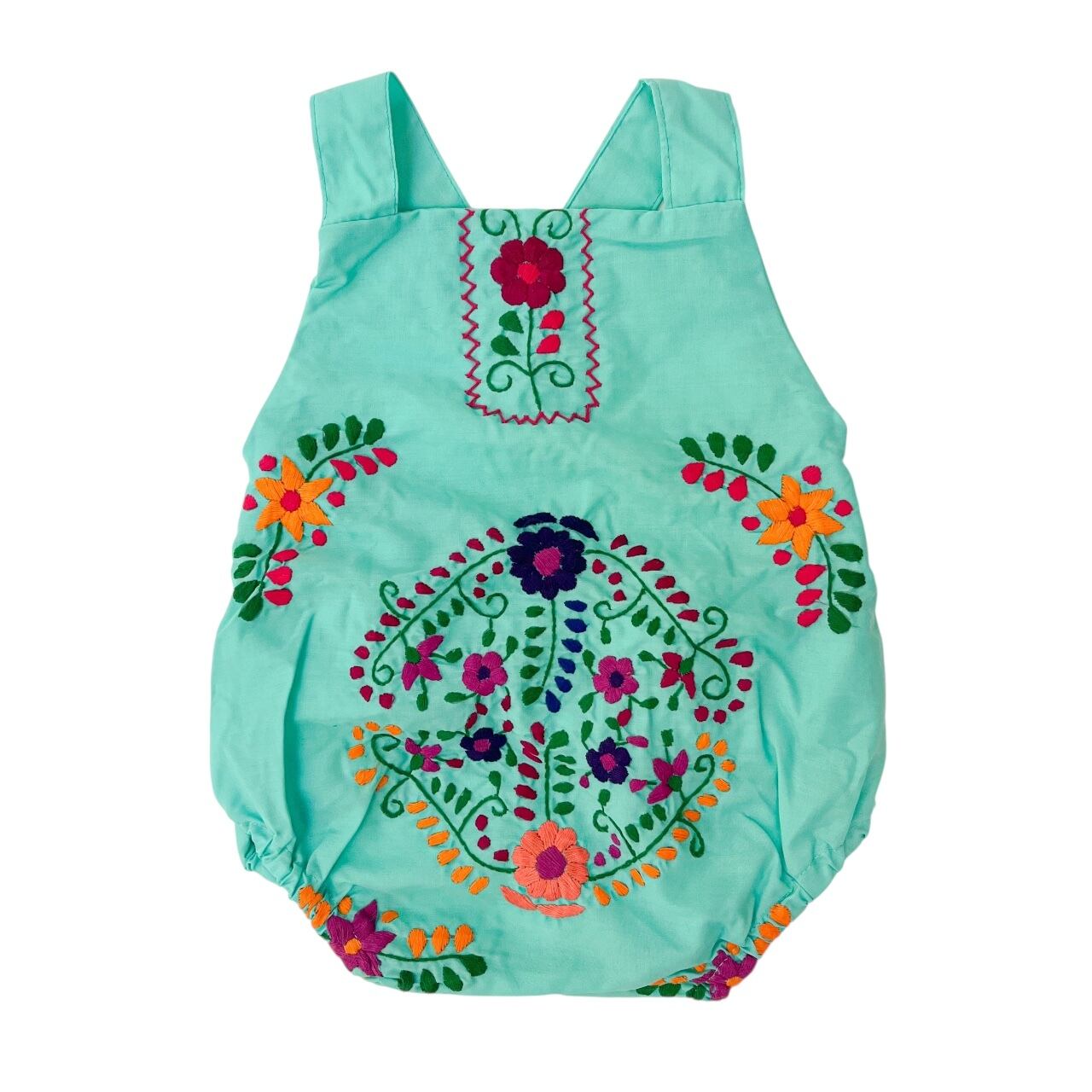 メキシコ刺繍がたっぷり施されたサロペットタイプのロンパース。