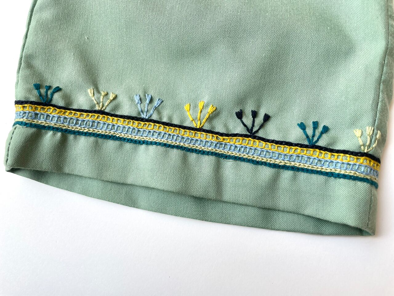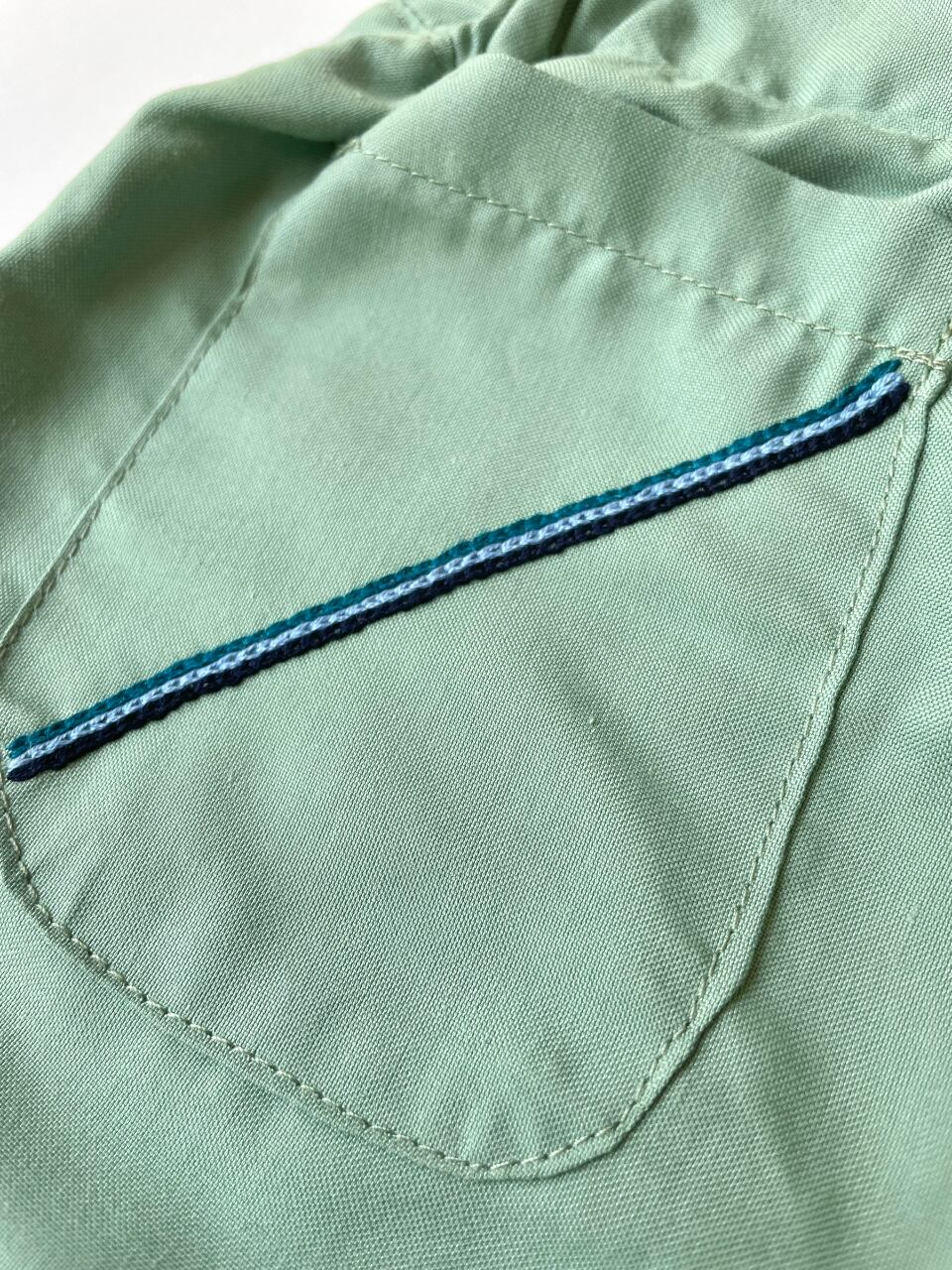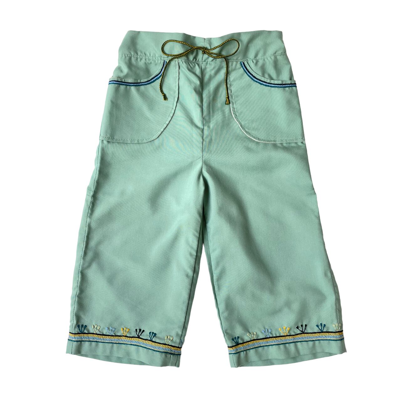 裾やポケットにチアパス州の可愛らしいチェーンステッチが入った上品なパンツ。