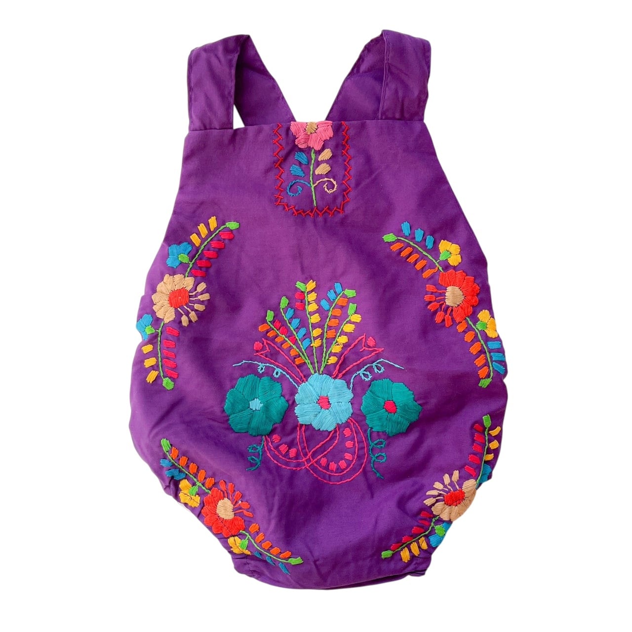 メキシコ刺繍がたっぷり施されたサロペットタイプのロンパース。