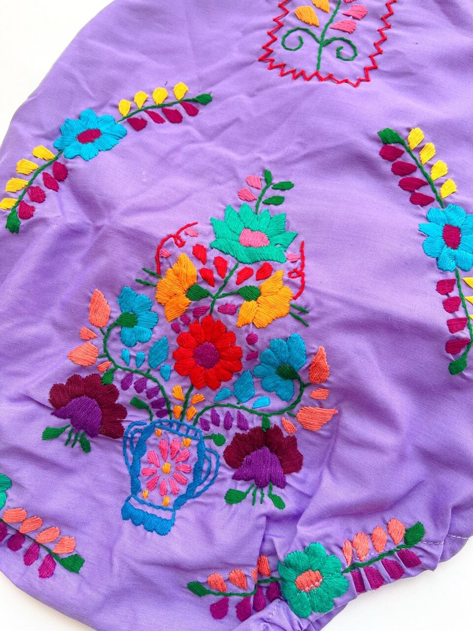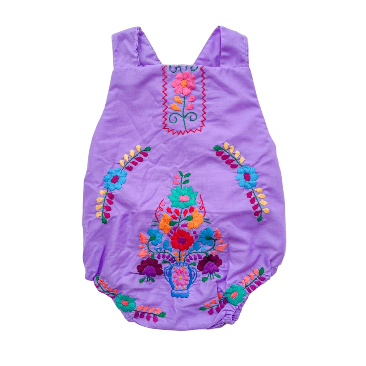 メキシコ刺繍がたっぷり施されたサロペットタイプのロンパース。