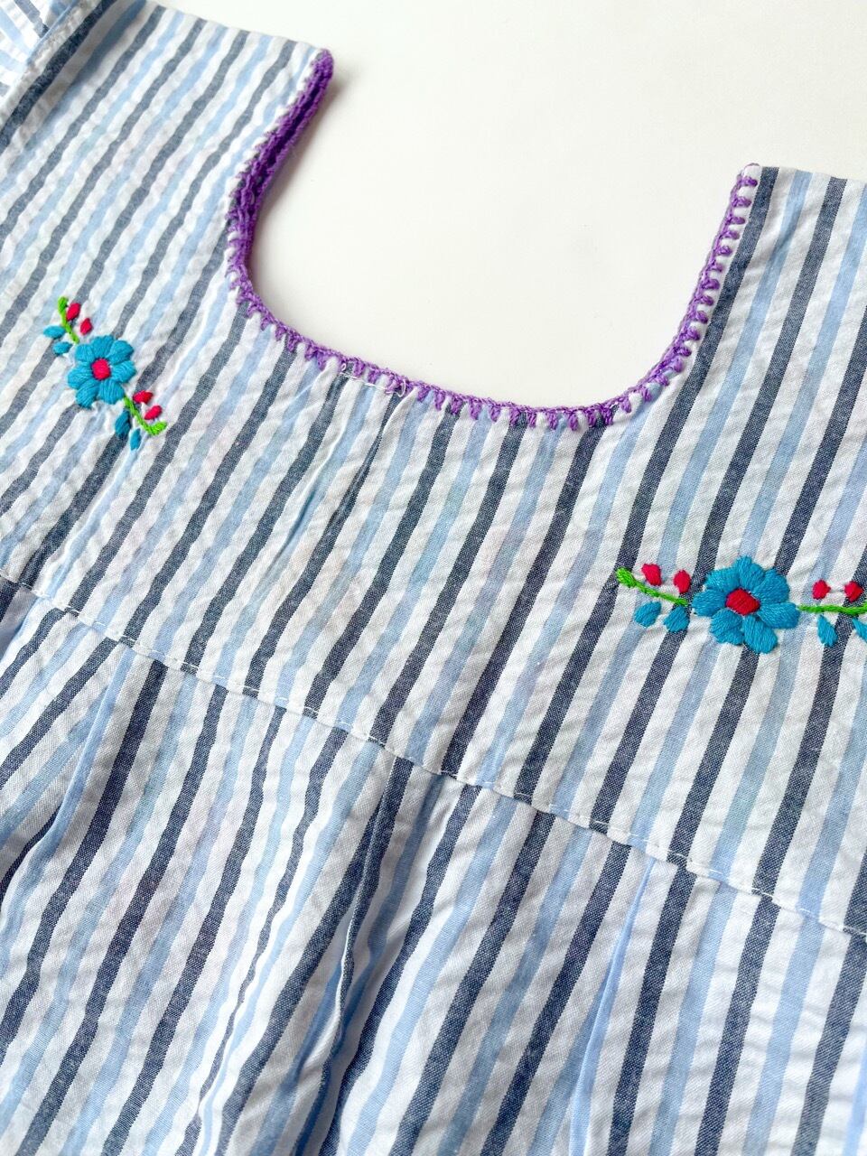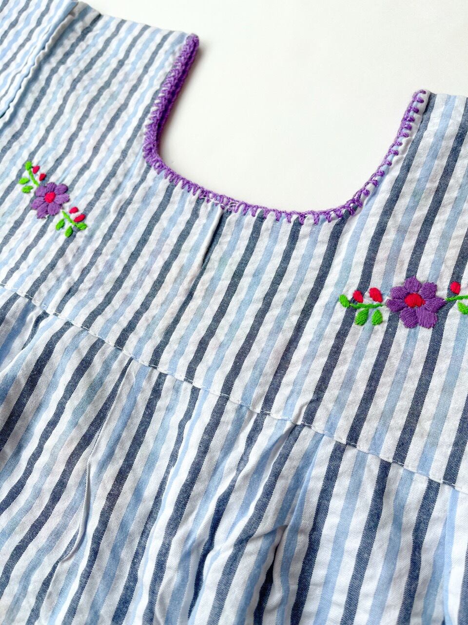 水色と黒のストライプ柄が珍しいメキシコ刺繍ブラウス。