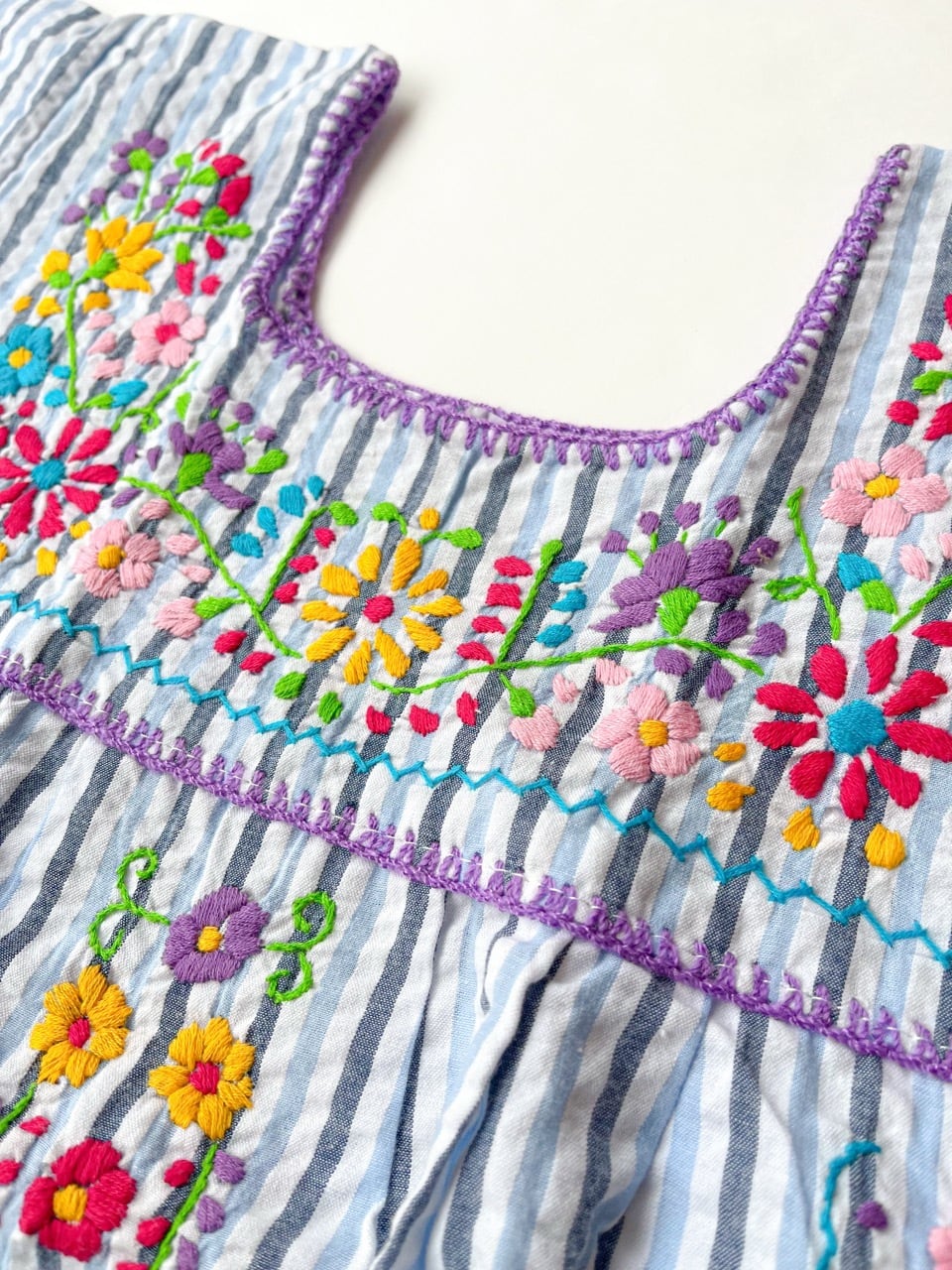 ビビッドカラーのブランケットステッチとカラフルなメキシコ刺繍が爽やかな雰囲気です。
