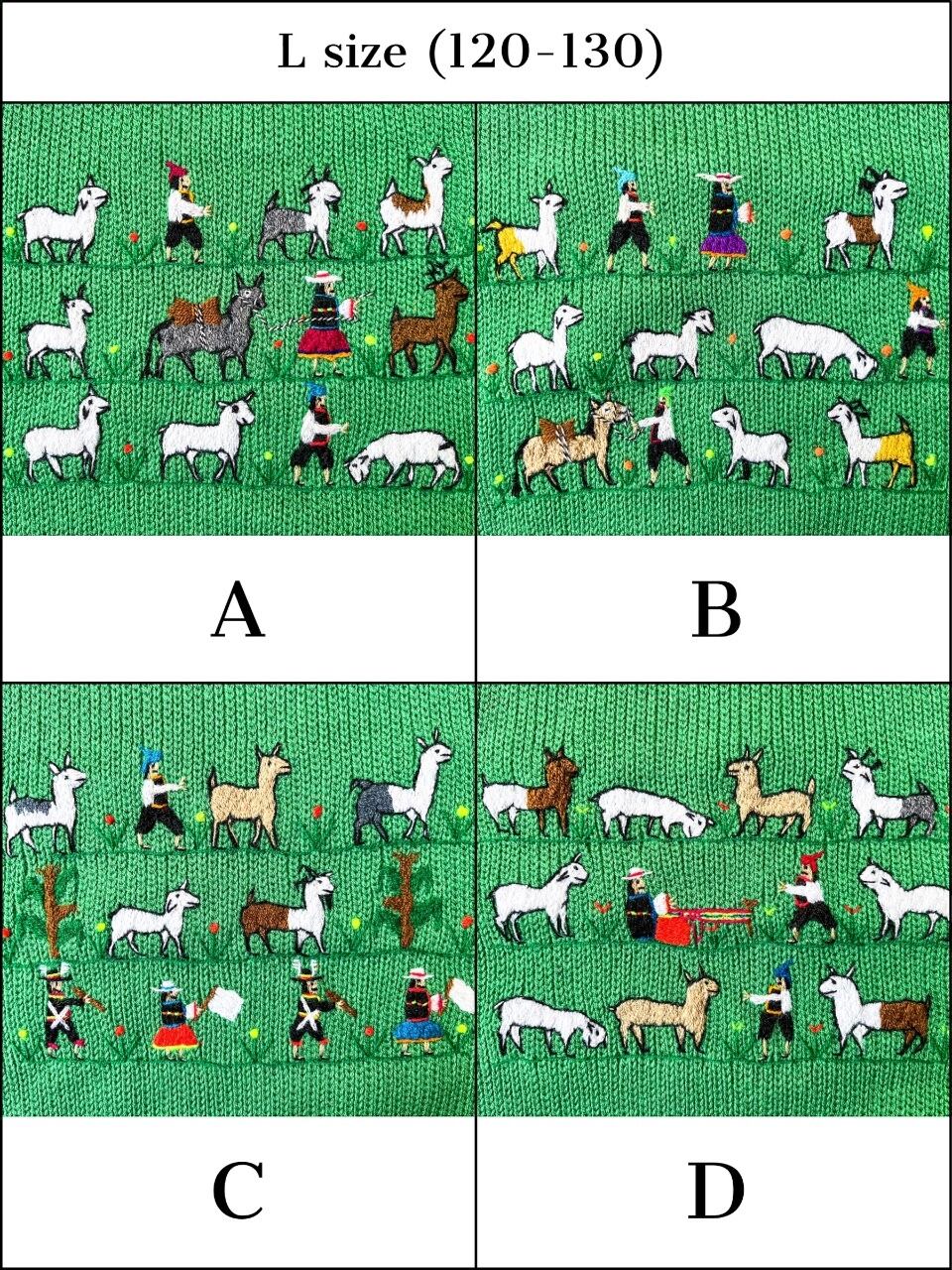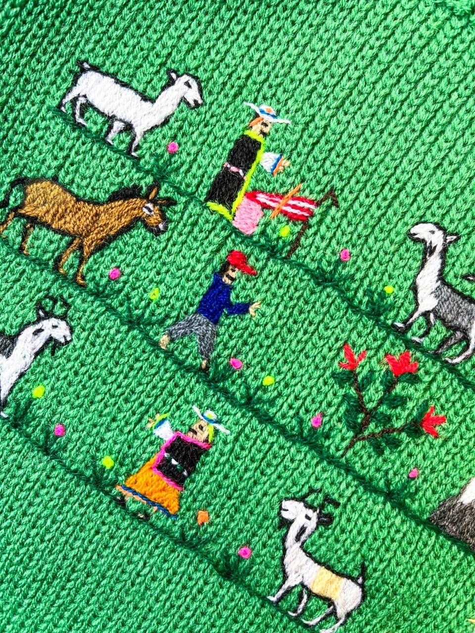 ボリビア農村部の日常風景が刺繍されたカラフルカラーのニットセーター。
